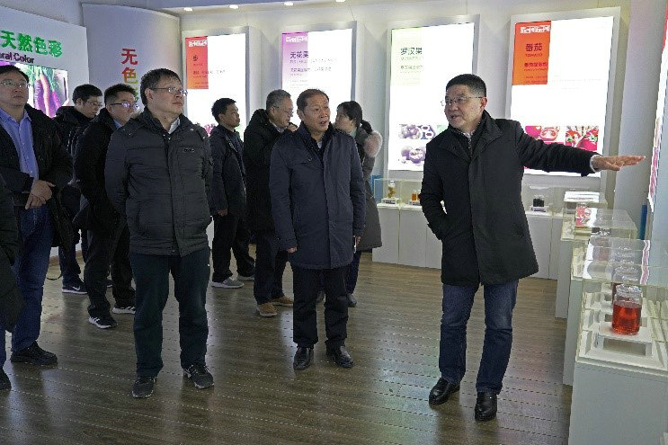 考察團(tuán)一路風(fēng)塵仆仆,沒有多余的寒暄,沒有片刻的歇息,就在李總的帶領(lǐng)下來(lái)到中大恒源“中國(guó)天然植物提取體驗(yàn)館”參觀。李總首先介紹了中大恒源的原料生產(chǎn)基地、天然色素、天然健康提取物、天然香精香料、生物替抗、植物染料等天然植物提取系列產(chǎn)品,看著色彩斑斕、琳瑯滿目的產(chǎn)品,令長(zhǎng)期奮斗在教學(xué)科研第一線的專家、教授們感到驚奇:“沒有想到一個(gè)企業(yè)能夠心系民族產(chǎn)業(yè),心系人類健康,把天然植物提取做得這么深、這么細(xì)、這么廣,真了不起!”